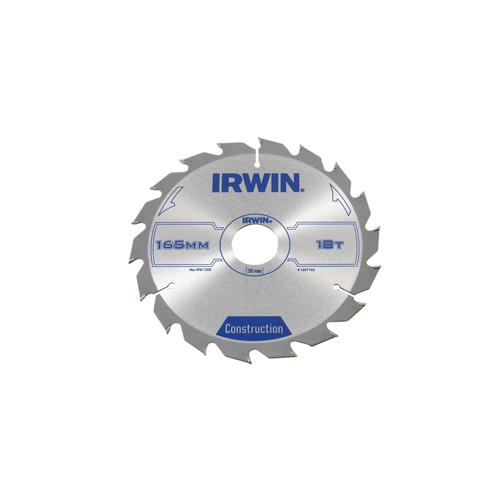 • The IRWIN IRW1897193 Circular Saw Blade has the following specifications: Blade diameter: 165mm.Bore: 30mm.Reduction Ring: 20, 16mm.Teeth: 18.